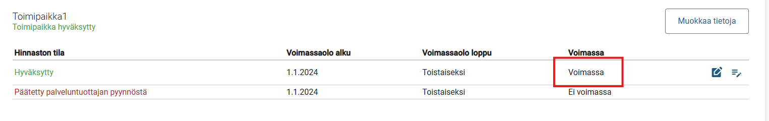 Avautuu ikkuna, jossa näkyy tieto onko hinnasto voimassa: